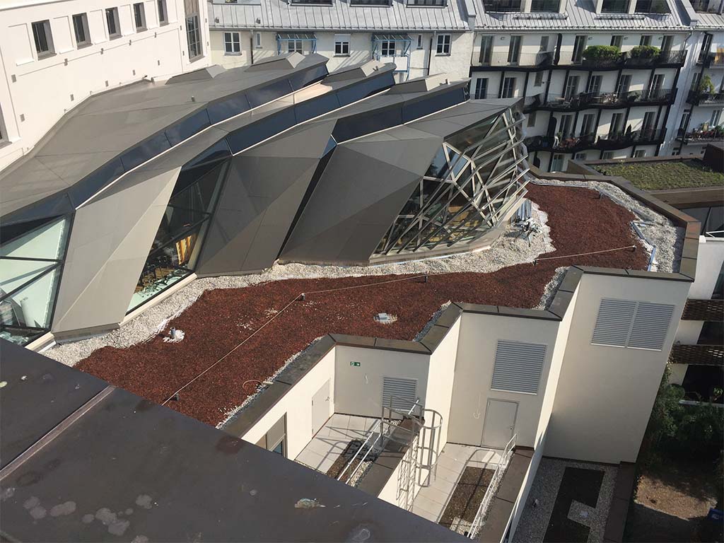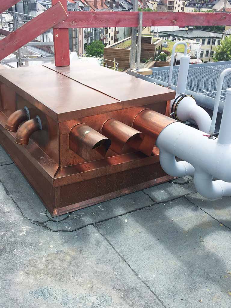 Gefälle-Wärmedämmung PUR, Bitumenabdichtung 2-lagig (Soprema), Plattenbeläge auf Splittbett, Geländerkonstruktion, Seilsicherungssystem (ABS), Verblechungen mit Kupferblech 0,7 mm
